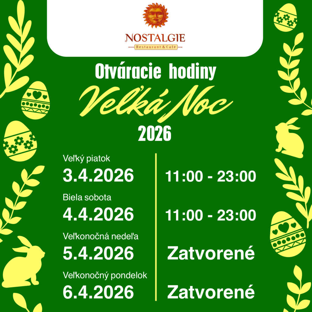 🔊 Milí hostia!Máme pre Vás malú zmenu otváracích hodín. V nedeľu 22.3.2026 je naša reštaurácia otvorená od 11.30 do 17.00 a v pondelok 23.3.2026 je zatvorená. Pripravujeme pre Vás čisté a bezpečné priestory🧹🛠🧼 .Tešíme sa na Vás v utorok 24.3.2026.Váš Nostalgie tím 🌞 … See MoreSee Less